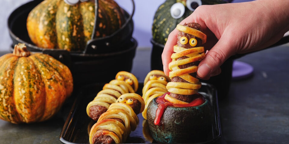 - Wrap three strips of pastry around each Beef Chevapchichi to resemble a mummy, leaving space for the eyes.