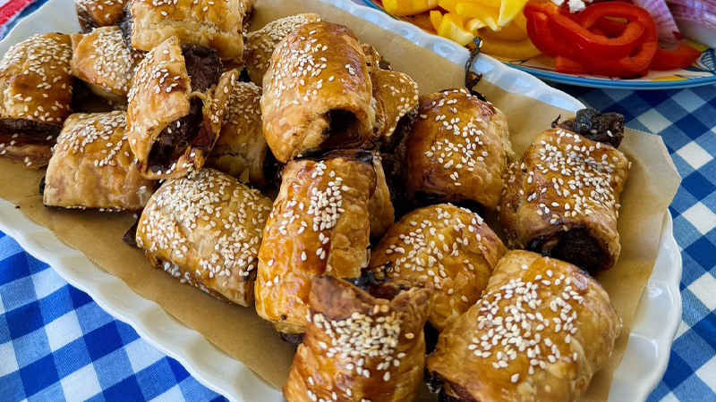Lay out a sheet of puff pastry, and spread out a layer of caramelised onion. Top with a line of Olga’s Fine Foods Beef Chevapchichis and roll them in the pastry. Cut sausage roll into pieces, then brush with egg wash and sprinkle with black sesame seeds.
