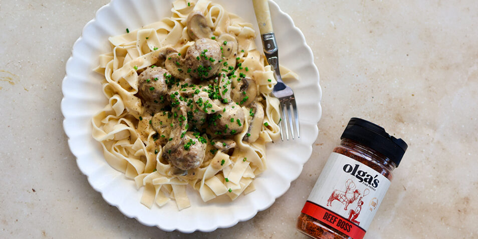 - Heat olive oil in the slow cooker pot on the ‘sear/brown’ function. Add the onion and saute for 2 minutes before adding the garlic and mushrooms. Season with Olga’s Fine Foods Beef Boss Rub, salt and pepper. Cook for 6-8 minutes, or until the mushrooms are softened.